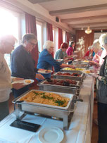 Kurz danach durften wir uns auch schon an dem leckeren Buffet mit Rübenschmaus, Kassler, Kohlwurst und Schweinebacke bedienen. Dazu vegetarische gebackenen Blumenkohl und Kürbis. Zum Nachtisch eine tolle Eiskreation mit Schattenmorellen.